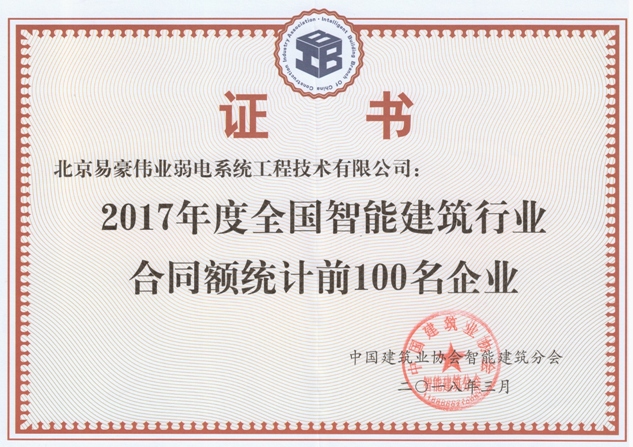 2018年3月,經(jīng)中國(guó)建筑業(yè)協(xié)會(huì)智能建筑分會(huì)的評(píng)選,我司榮獲“2017年度全國(guó)智能建筑行業(yè)百?gòu)?qiáng)企業(yè)”榮譽(yù)稱號(hào)。