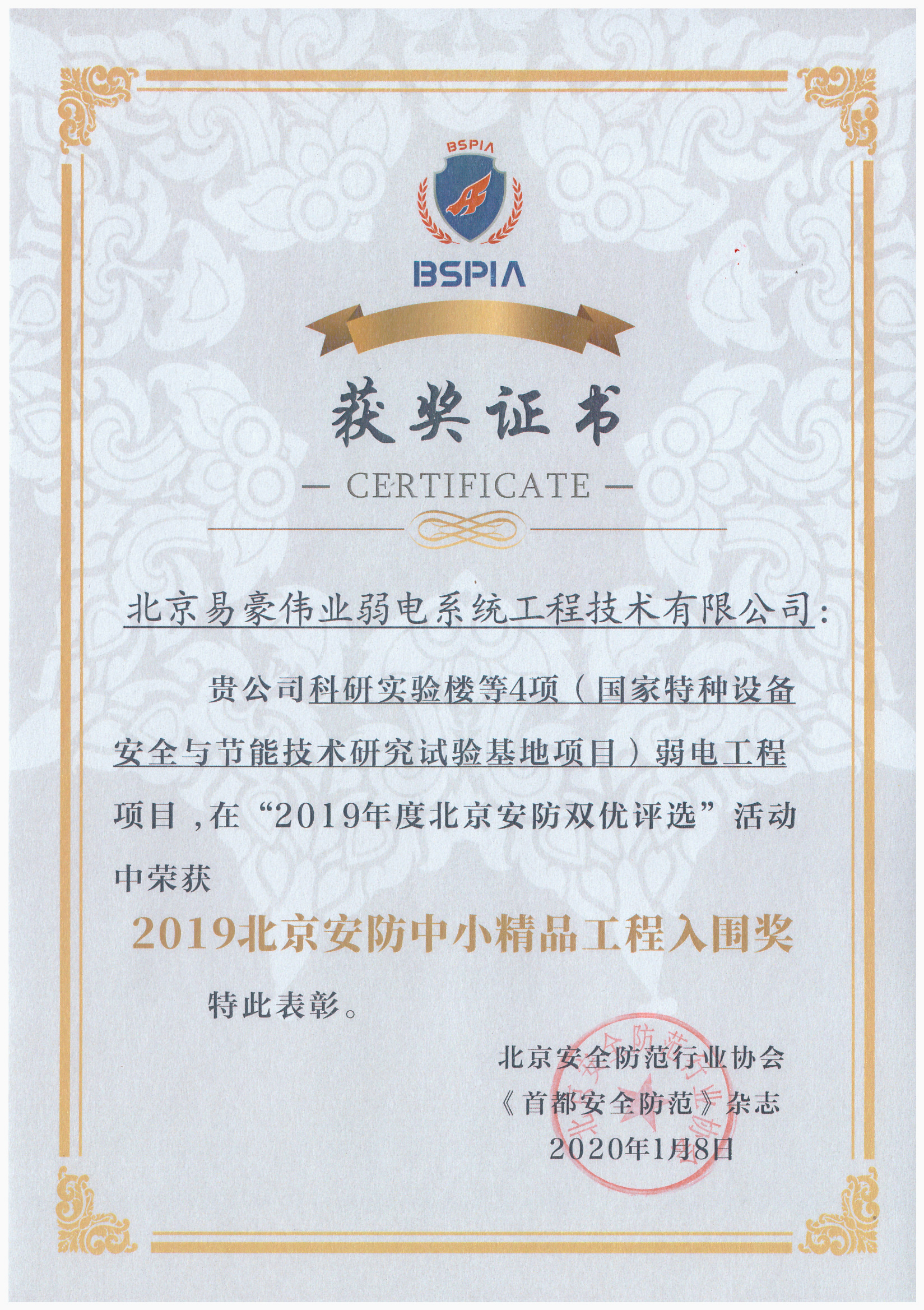2020年1月8日,我公司科研實(shí)驗(yàn)樓等4項(xiàng)(國家特種設(shè)備安全與節(jié)能技術(shù)研究試驗(yàn)基地項(xiàng)目)弱電工程項(xiàng)目,在“2019年度北京安防雙優(yōu)評(píng)選”活動(dòng)中榮獲2019北京安防中小精品工程入圍獎(jiǎng)。