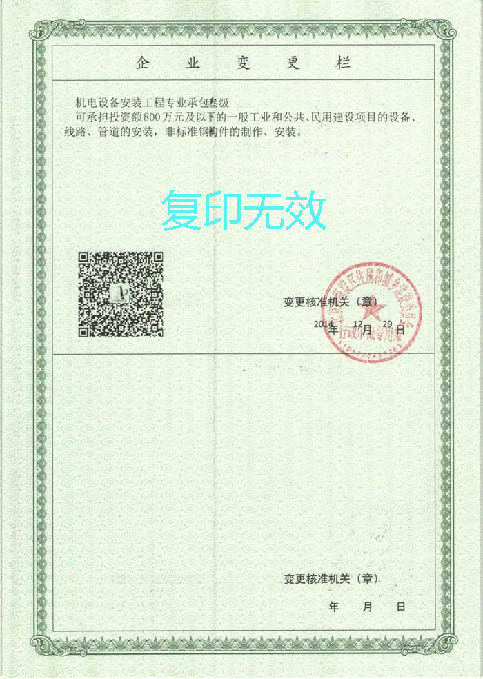 我公司于2014年12月獲得機(jī)電設(shè)備安裝工程專業(yè)承包三級(jí)資質(zhì)。