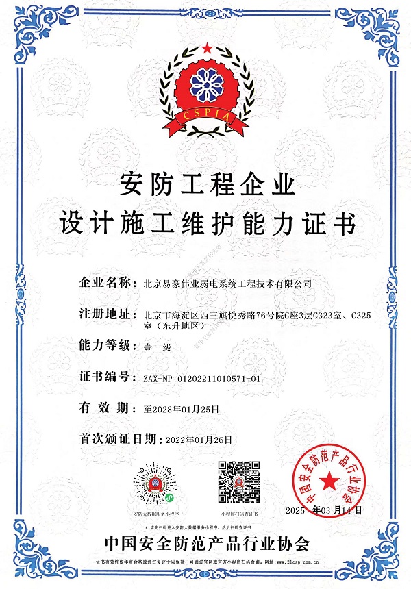 安防工程企業(yè)設(shè)計施工維護能力壹級證書