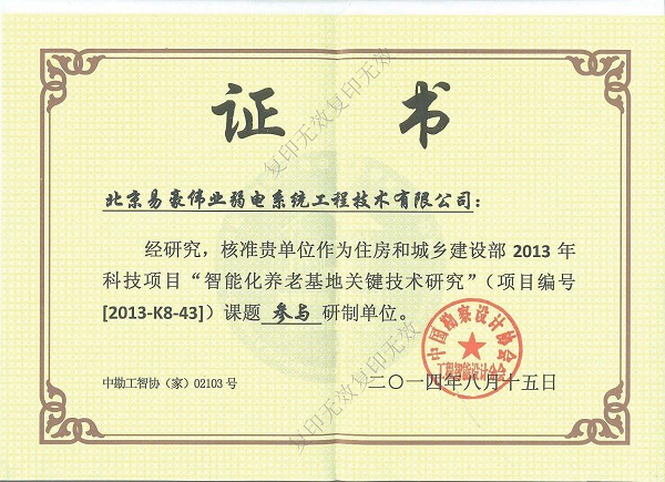 “智能化養(yǎng)老基地關(guān)鍵技術(shù)研究”課題參與研制單位證書