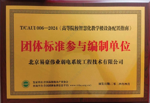 《高等院校智慧化教學(xué)樓設(shè)備配置指南》團(tuán)體標(biāo)準(zhǔn)參與編制單位證書